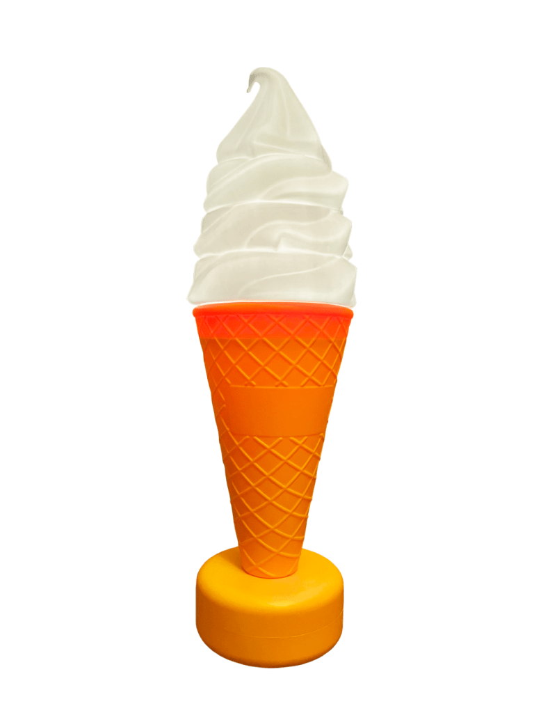Lo usamos como punto de referencia, normalmente digo: donde veas el cono de helado gigante, ahí es. Es resistente, no consume casi energía y se limpia fácil. Es publicidad fija.